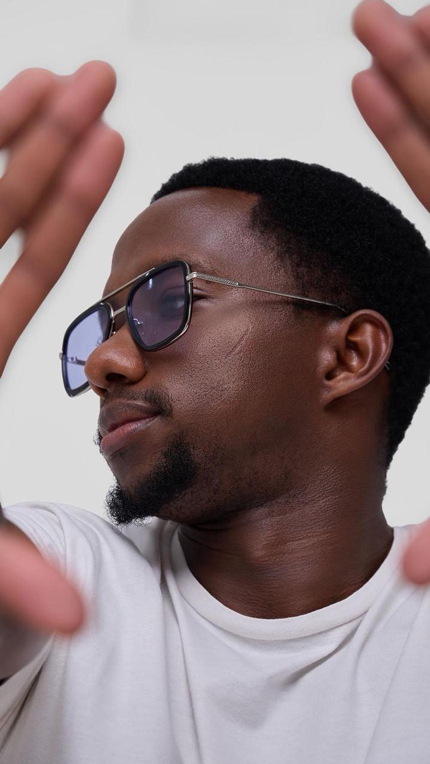 leek and modern—the Stoner Blue Sunglasses feature a bold square frame, polished silver-tone details, and cool blue lenses for a statement look
