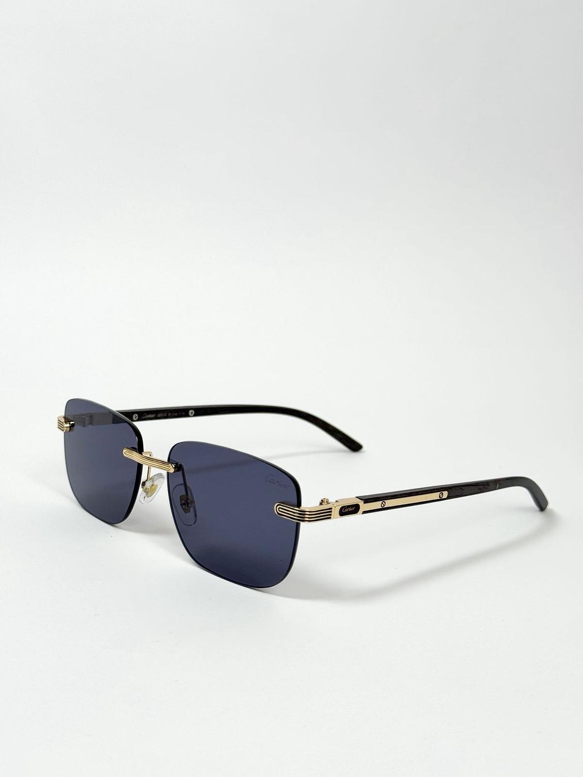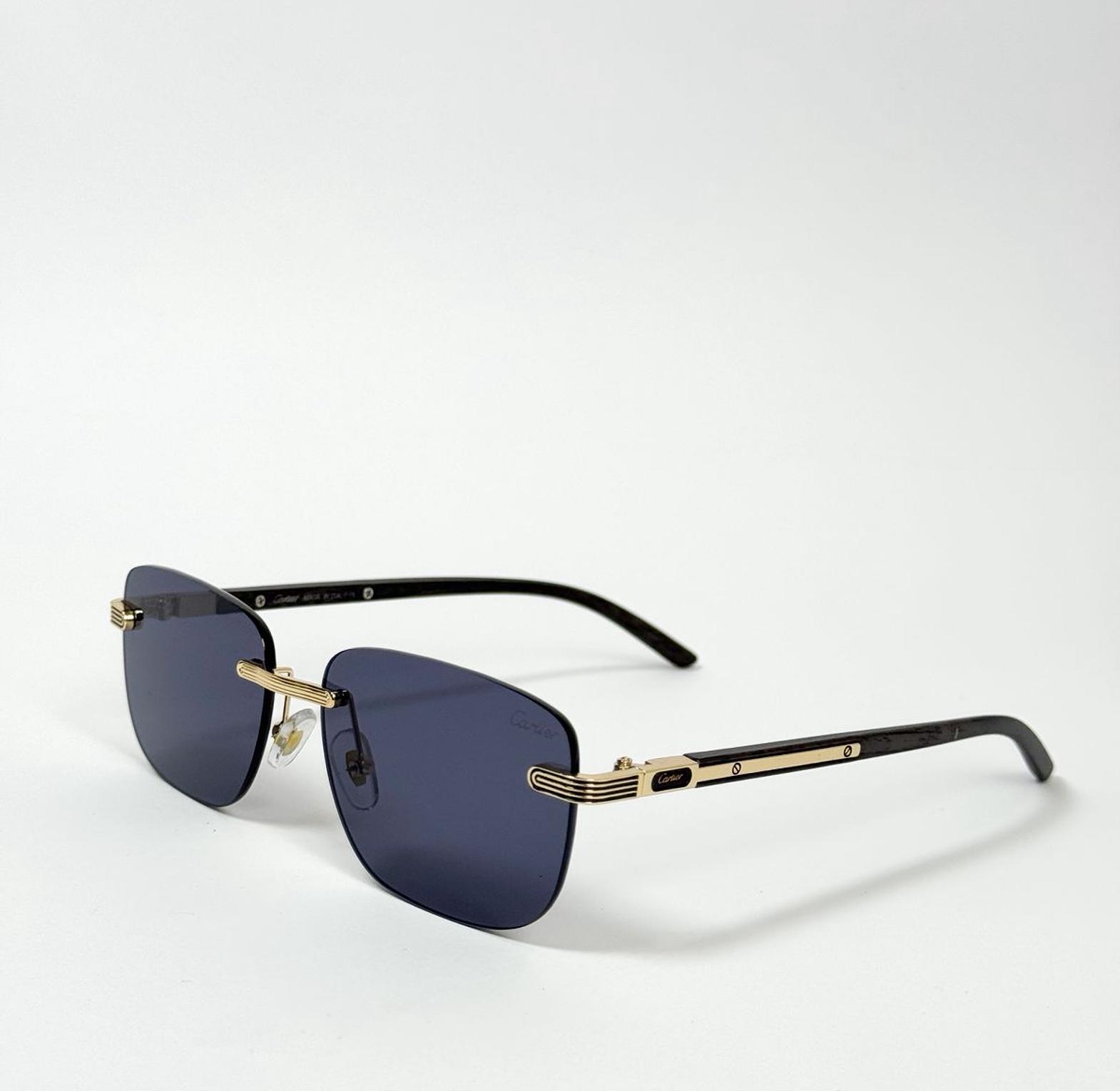 These elegant rimless sunglasses showcase a timeless design, featuring sleek black composite temples adorned with the iconic golden C Décor. The classic rectangular shape and solid dark lenses offer a sophisticated, powerful look for the discerning buyer.