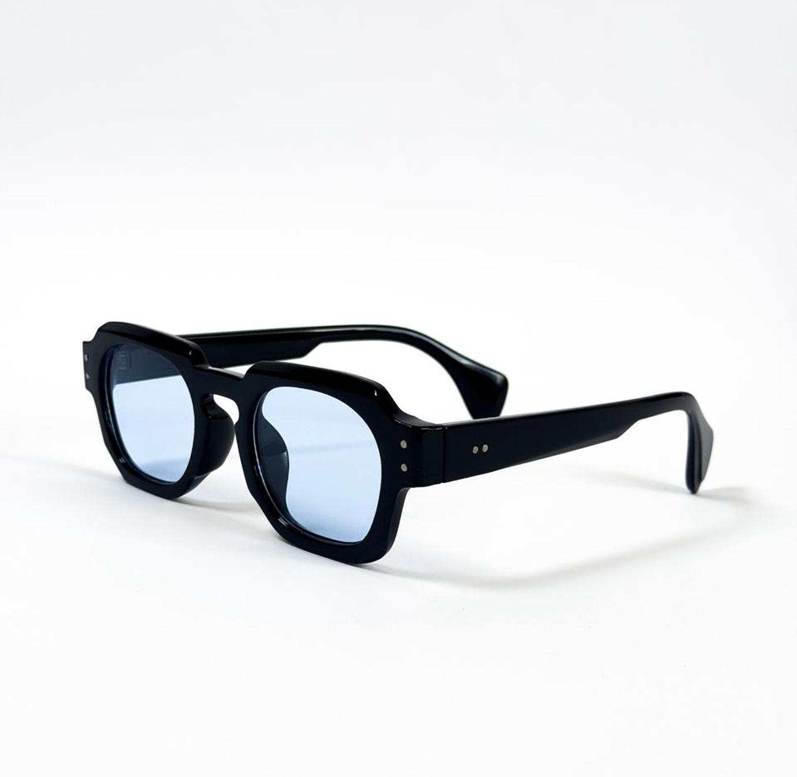 These bold black shades feature a unique, multi-sided geometric lens shape for a cutting-edge aesthetic. The light azure blue lenses introduce a surprising pop of color, making them a distinctive modern accessory.