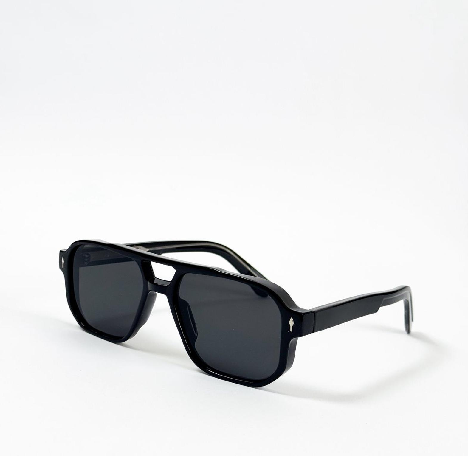 These bold sunglasses modernize the classic aviator style with a striking geometric lens shape and flat top bar. Finished in sleek black acetate, they feature a subtle signature arrow motif on the temple for an added touch of distinction.