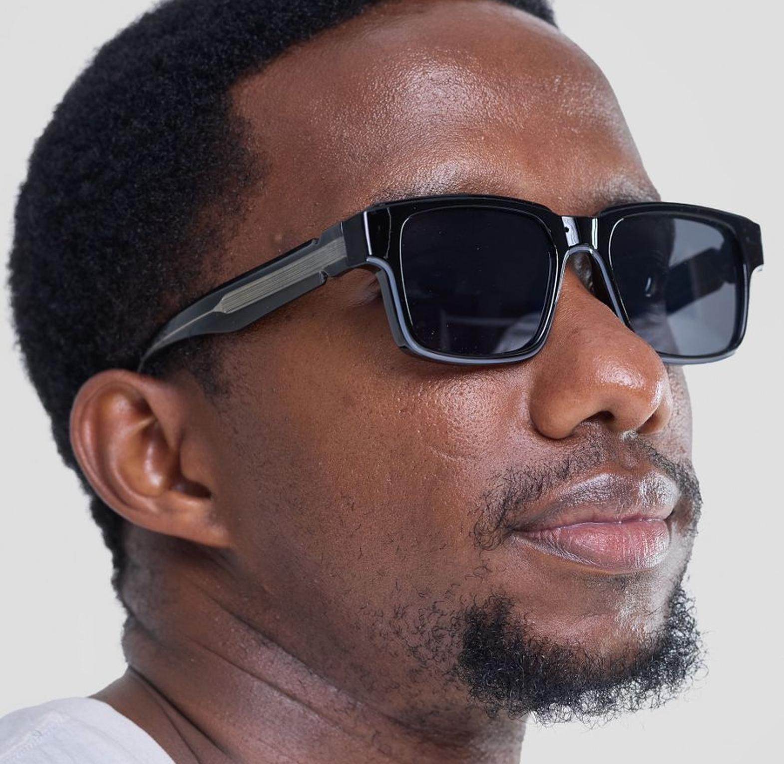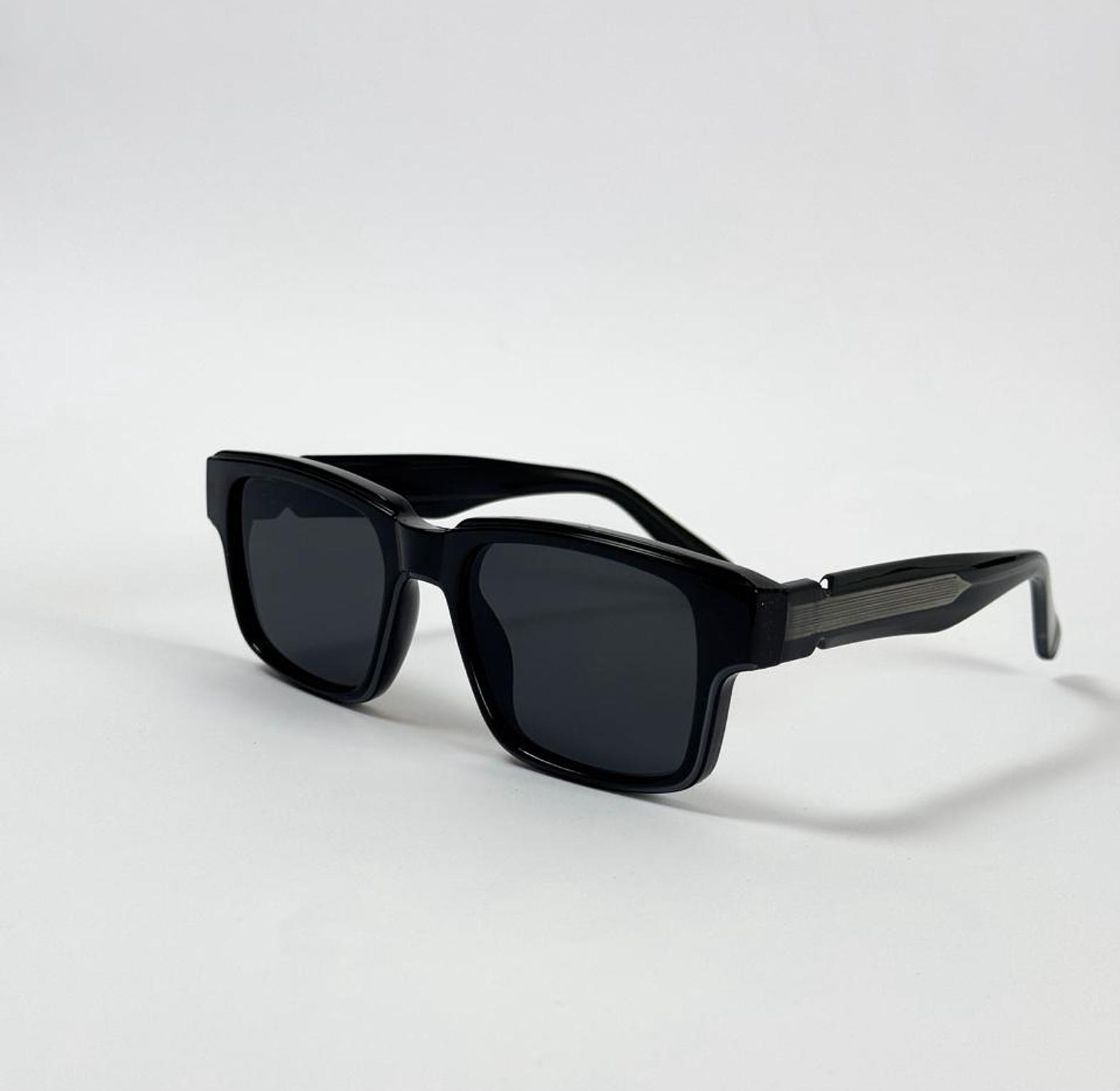These bold, rectangular sunglasses offer a strong silhouette in deep black acetate for a definitive urban look. A distinct metallic stripe detail on the arm adds a modern, architectural edge to the classic design.