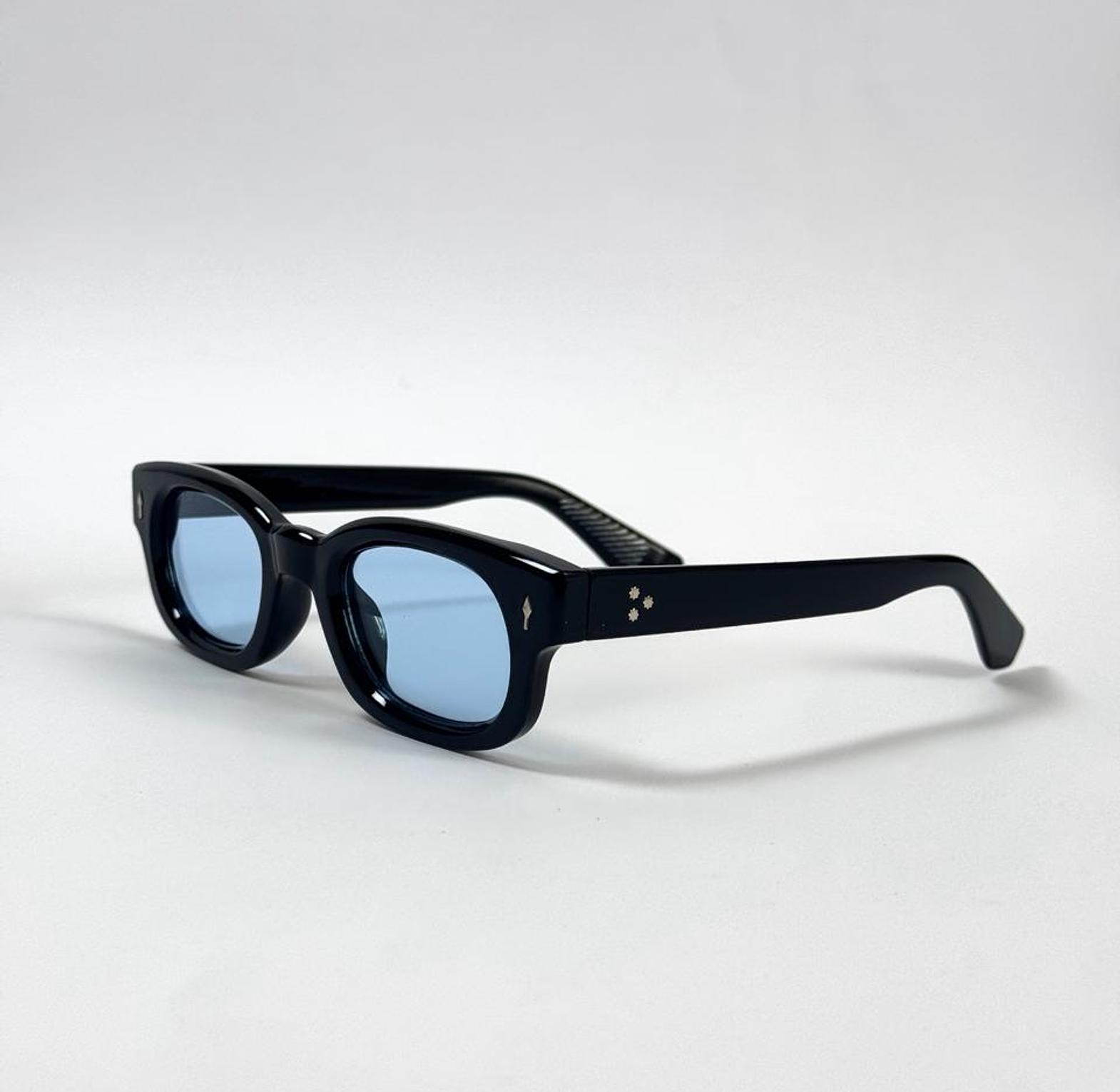 Embrace the bold, narrow trend with these high-shine black frames featuring a striking, cool-toned azure lens. This piece delivers a high-impact, street-style aesthetic with an unexpected pop of color.